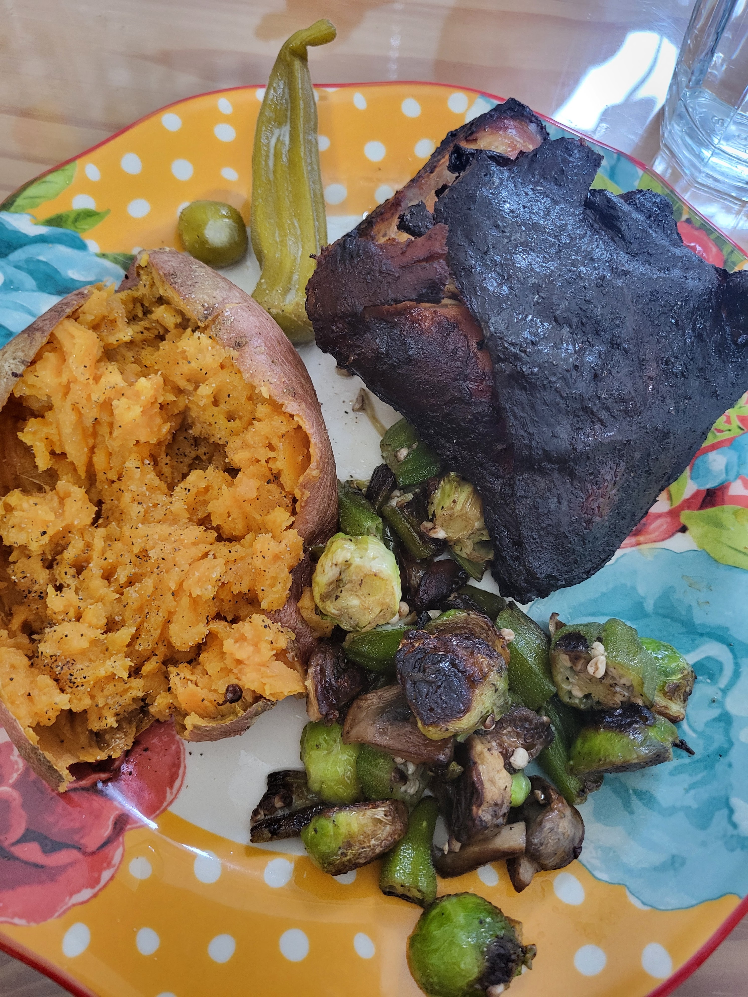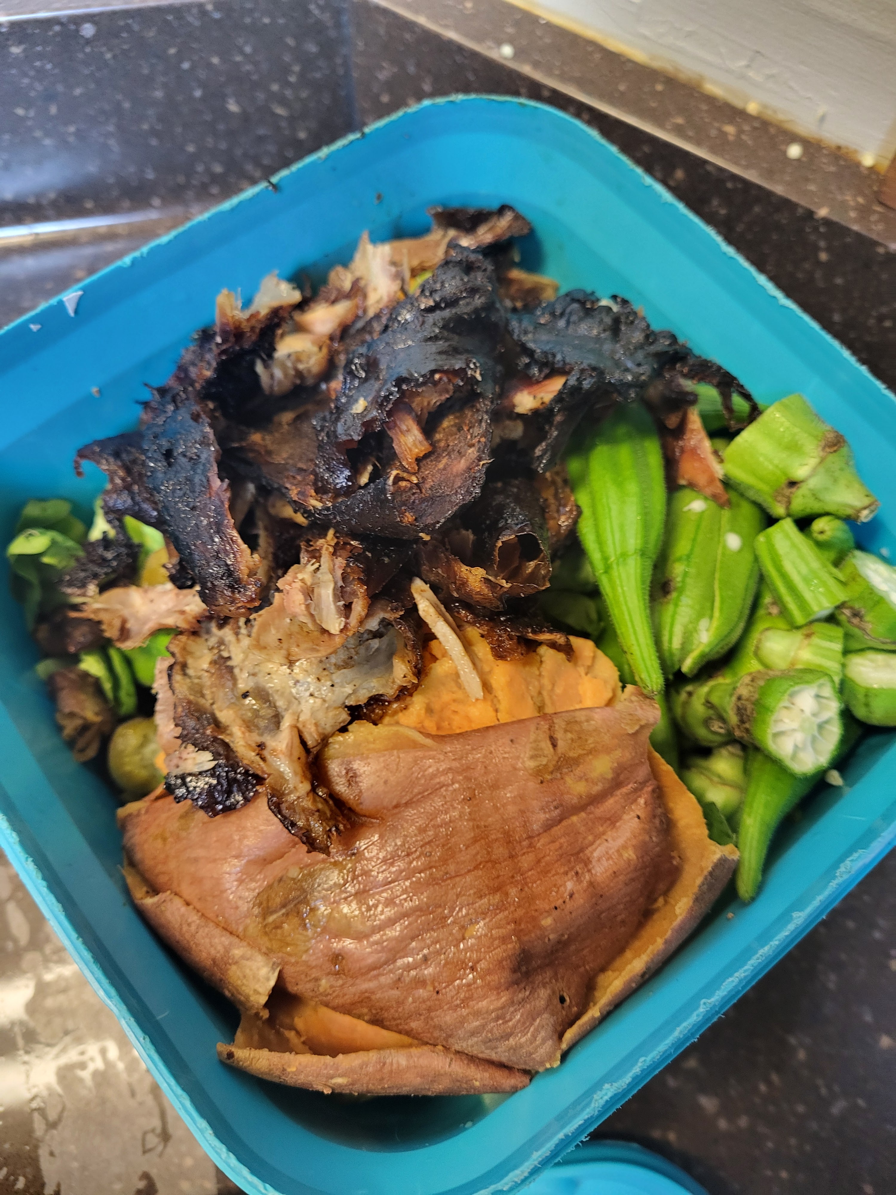 Chicken cooked this much tends to be dry, but remains usable. I selected a few of the larger pieces (because they would be the least dry) to have for dinner and heated them up to go with sweet potatoes and blackened okra. A little honey mustard to dip the chicken pieces in would be a great addition here, if you have some, or you can make some by adding a bit of sweetener to some mustard and a splash of milk.