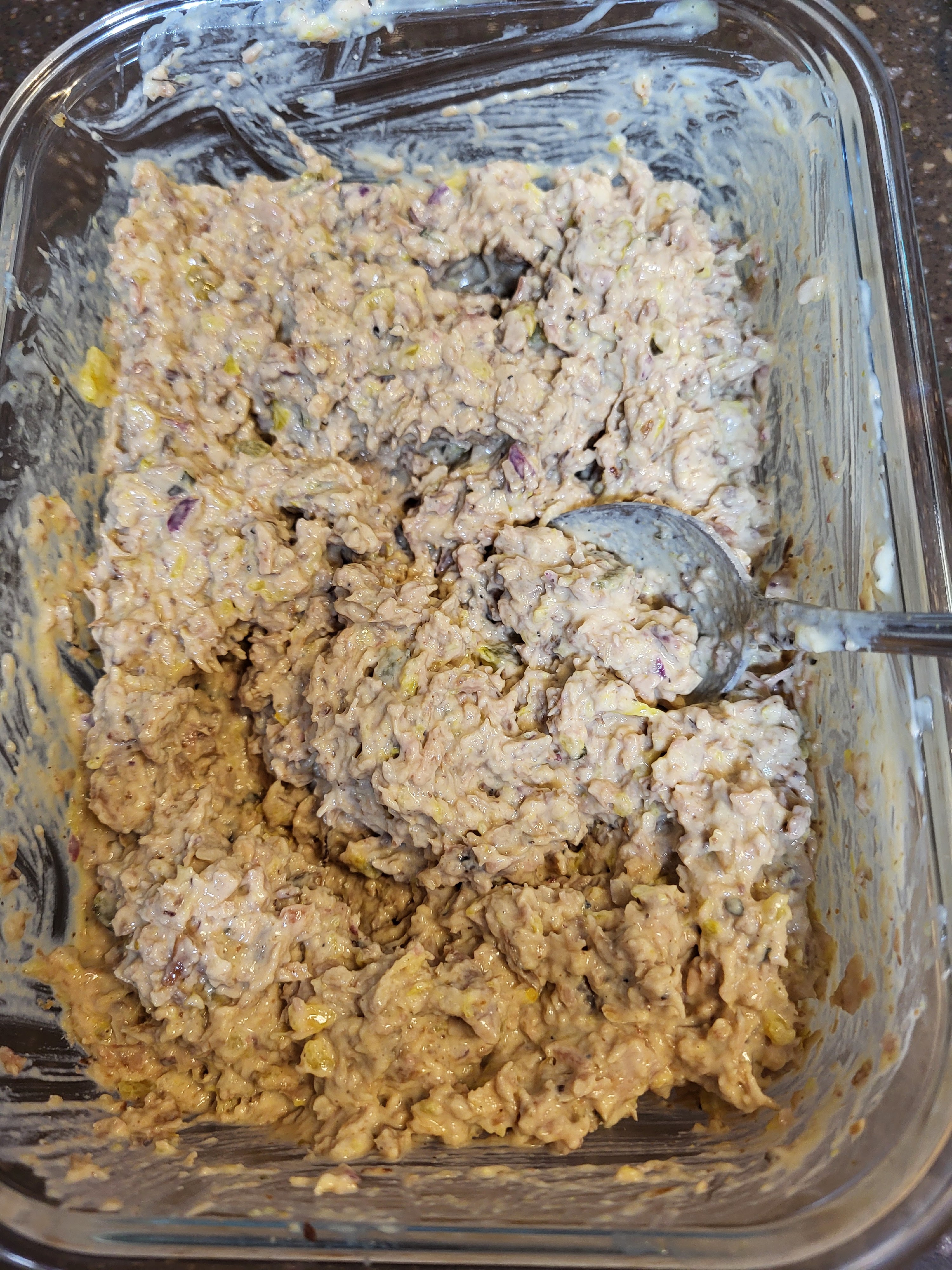 After we ate, I took the rest of the chicken pieces and deboned it, keeping the best parts of the meat. Some were too dry and hard to really be eaten. The bones were discarded, the skin and cartilage were put into our chicken scraps box, adding great protein to our chicken’s diet. The salvageable meat was put into my food processor with some onion and garlic and processed well to make into chicken salad. I used some of my homemade relish, mayo, and a bit of Greek yogurt but I didn’t have quite enough mayo. To finish it off, I found some honey mustard in the fridge (that incidentally also came from a different event that had leftover food) and added it. Honestly, it was some of the best chicken salad we’ve had. The next day, I went to get the leftovers for lunch, and my daughter was smirking at me because she had gotten to it first! It was that good!